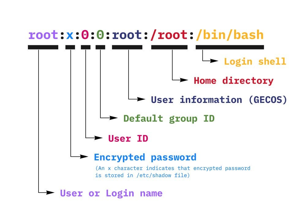 1 โ username (1-32 chars) 2 โ password (x โ encrypted, salted pwd โ /etc/shadow) 3 โ user id (0 โ root, 1-99 โ predefined account, 100-999 โ system account) 4 โ group id (the primary group id stored in /etc/group file) 5 โ GECOS info or user id info (extra info about the user name, phone number etc) 6 โ home dir (path the user will be in when they login) 7 โ command/shell (the abs path of the command or shell)