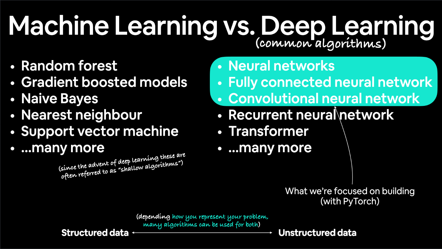 - Machine Learning mostly deals with structured data while Deep Learning deals with unstructured data and converts them into numbers (tensors)